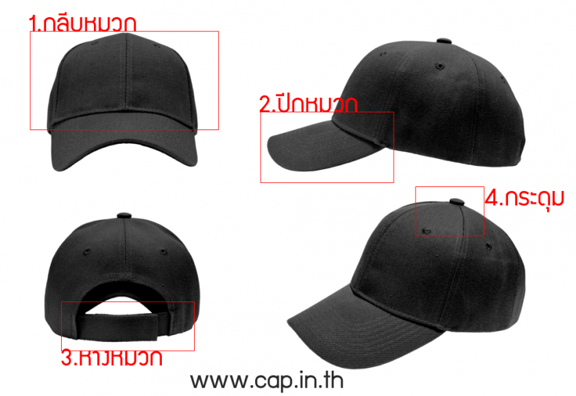 - กระดุม (มี 2 แบบ แบบมีกระดุมบนหัวหมวก และแบบไม่มี)